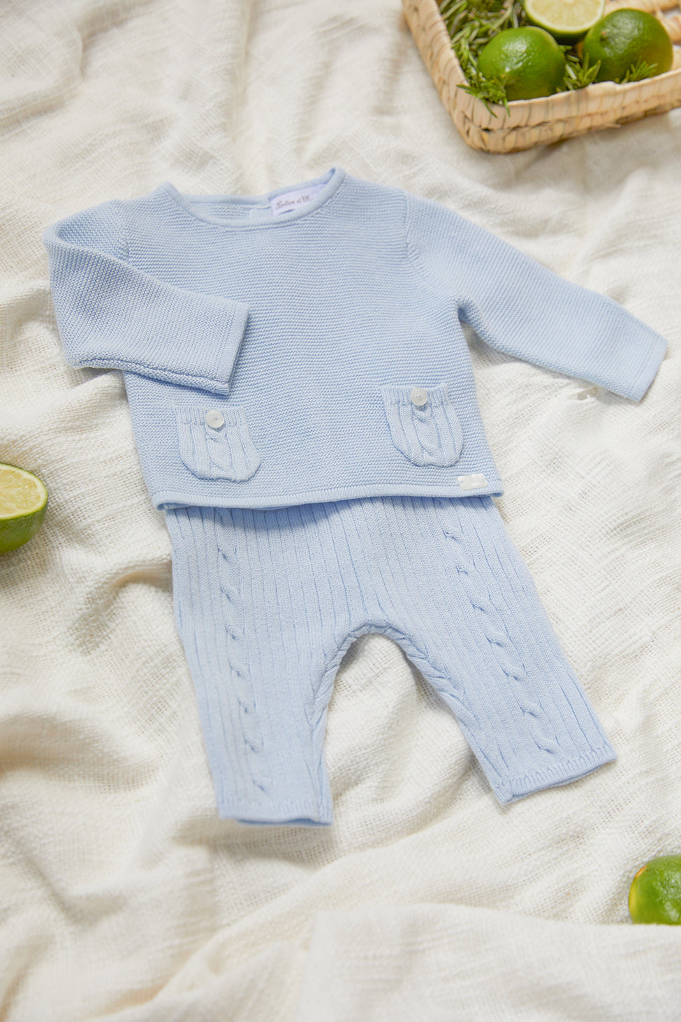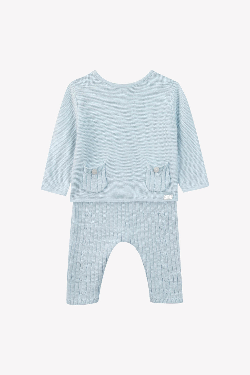 Deze lange set in hemelsblauw is ideaal om kleintjes stijlvol en comfortabel aan te kleden. Het is voorzien van gedraaide details en een ronde hals. De zakken aan de bovenkant zorgen voor een vleugje charme. De elastische tailleband aan de onderkant zorgt voor een comfortabele pasvorm en volgt de bewegingen van uw baby. Een zacht en verfijnd kledingstuk, perfect voor de eerste dagen van uw baby. CA36010-41